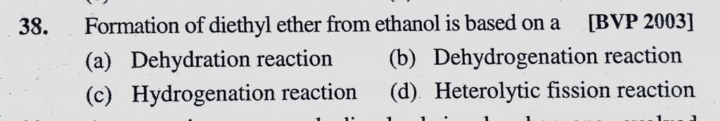 Formation of diethyl ether from ethanol is based on a (a) Dehydration reaction (b) Dehydrogenation reaction (c) Hydrogenation (d) Heterolytic fission reaction Formation of diethyl ether from ethanol is based on a (a) Dehydration reaction (b) Dehydrogenation reaction (c) Hydrogenation (d) Heterolytic fission reaction February 10, 2021 Category: Uncategorised (JEE Advanced Physics by BM Sharma + GMP Solutions) , Facebook Messenger WhatsApp Share this:TwitterFacebook Related