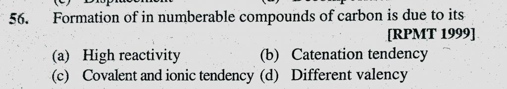 Formation of in numberable compounds of carbon is due to its (a) High reactivity (b) Catenation tendency (c) Covalent and ionic tendency (d) Different valency Formation of in numberable compounds of carbon is due to its (a) High reactivity (b) Catenation tendency (c) Covalent and ionic tendency (d) Different valency November 18, 2020 Category: Uncategorised (JEE Advanced Physics by BM Sharma + GMP Solutions) , Facebook Messenger WhatsApp Share this:TwitterFacebook Related