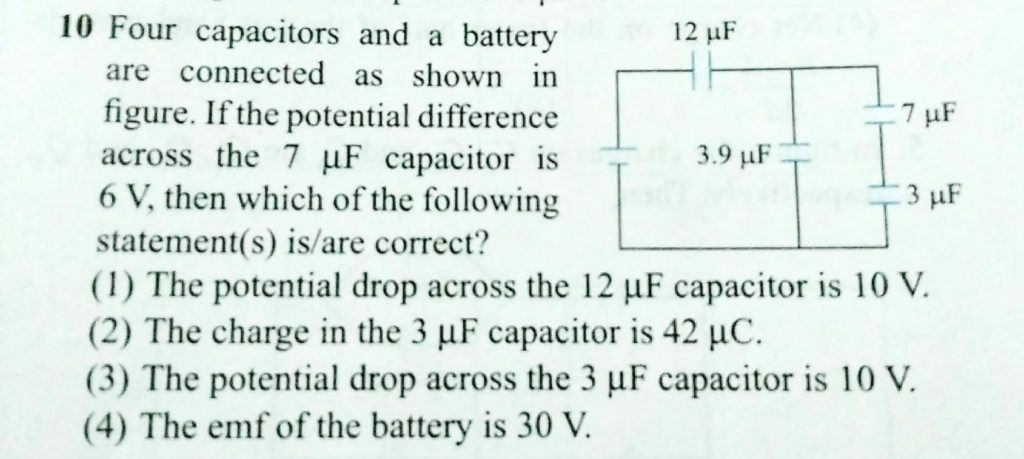 Four capacitors and a battery are connected as shown in figure. If the potential difference across the 7 muF capacitor is 6 V, then which of the following statements is /are correct ? Four capacitors and a battery are connected as shown in figure. If the potential difference across the 7 muF capacitor is 6 V then which of the following statements is /are correct ? November 8, 2020 Category: Uncategorised (JEE Advanced Physics by BM Sharma + GMP Solutions) , Facebook Messenger WhatsApp Share this:TwitterFacebook Related