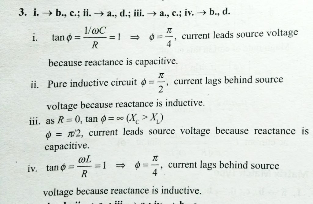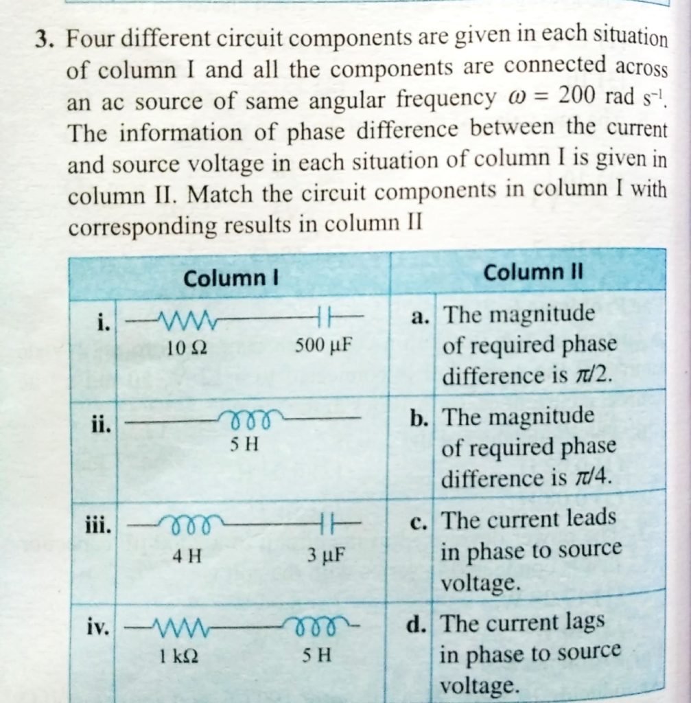 Four different circuit components are given in each situation of coulmn I nad all the componrents are connected across an ac source of same angular frequency omega = 200 rad/s. THe information of phase difference between the current and source voltage in each situation of column I is given in column II . Match the circuit components in column I with corresponding results in column II