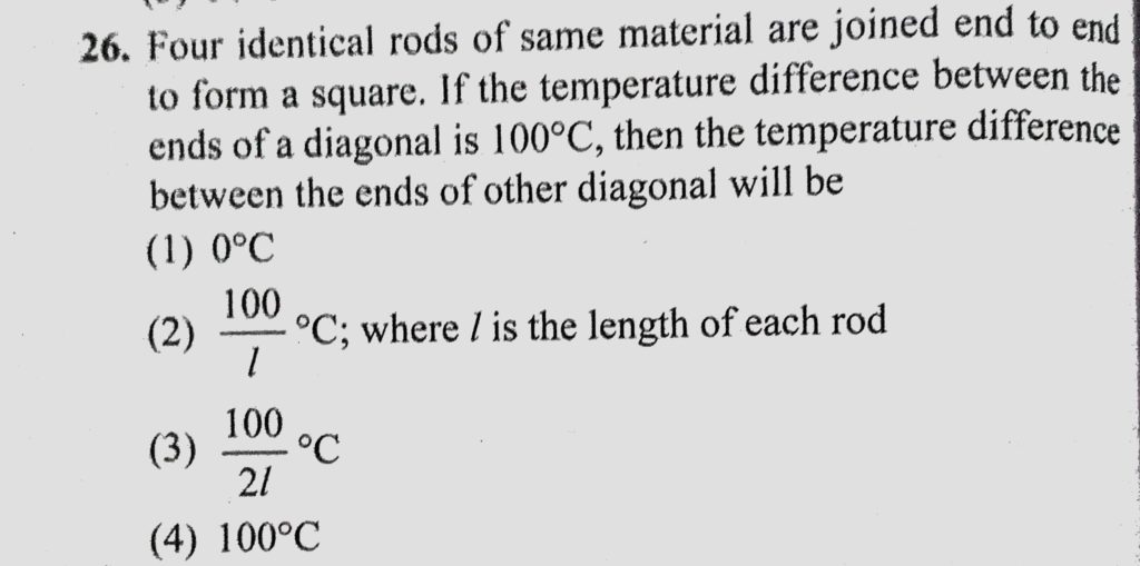 Four identical rods of same material are joined end to end to form a square. If the temperature difference between the ends of a diagonal is 100 C, then the temperature difference Four identical rods of same material are joined end to end to form a square. If the temperature difference between the ends of a diagonal is 100 C then the temperature difference October 25, 2020 Category: Uncategorised (JEE Advanced Physics by BM Sharma + GMP Solutions) , Facebook Messenger WhatsApp Share this:TwitterFacebook Related