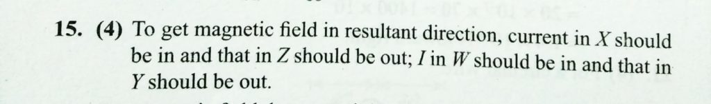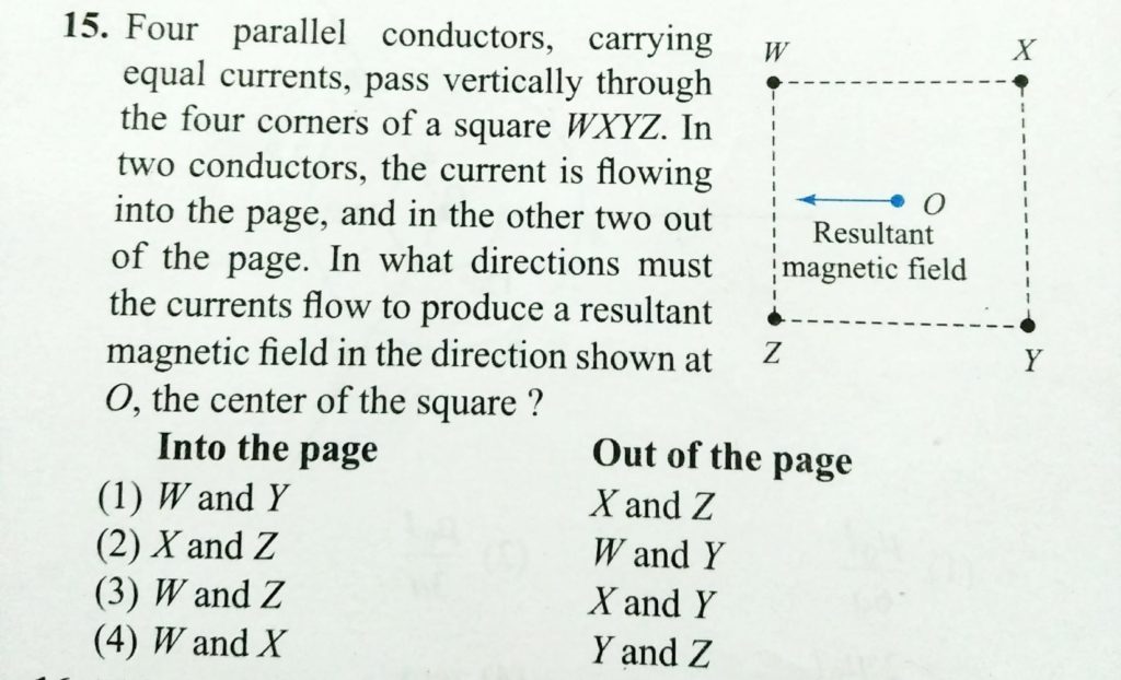 Four parallel conductors, carrying equal currents, pass vertically through the four corners of a square WXYZ. In two conductors, the current is flowing into the page, and in the other two out into the page, and in the other two out of the page. In what directions must the currents flow to produce a resultant magnetic field in the direction shown at O, the centre of the square?