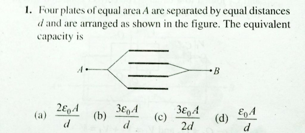 Four plates of equal area A are seperated by equal distances d and are arranged as shown in the figure. The equivalent capacity is Four plates of equal area A are seperated by equal distances d and are arranged as shown in the figure. The equivalent capacity is September 18, 2020 Category: Uncategorised (JEE Advanced Physics by BM Sharma + GMP Solutions) , Facebook Messenger WhatsApp Share this:TwitterFacebook Related