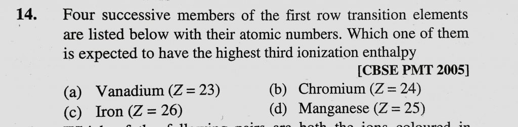 Four successive members of the first row transition elements are listed below with their atomic numbers. Which one of them is expected to have a highest third ionization enthalpy Four successive members of the first row transition elements are listed below with their atomic numbers. Which one of them is expected to have a highest third ionization enthalpy November 29, 2020 Category: Uncategorised (JEE Advanced Physics by BM Sharma + GMP Solutions) , Facebook Messenger WhatsApp Share this:TwitterFacebook Related