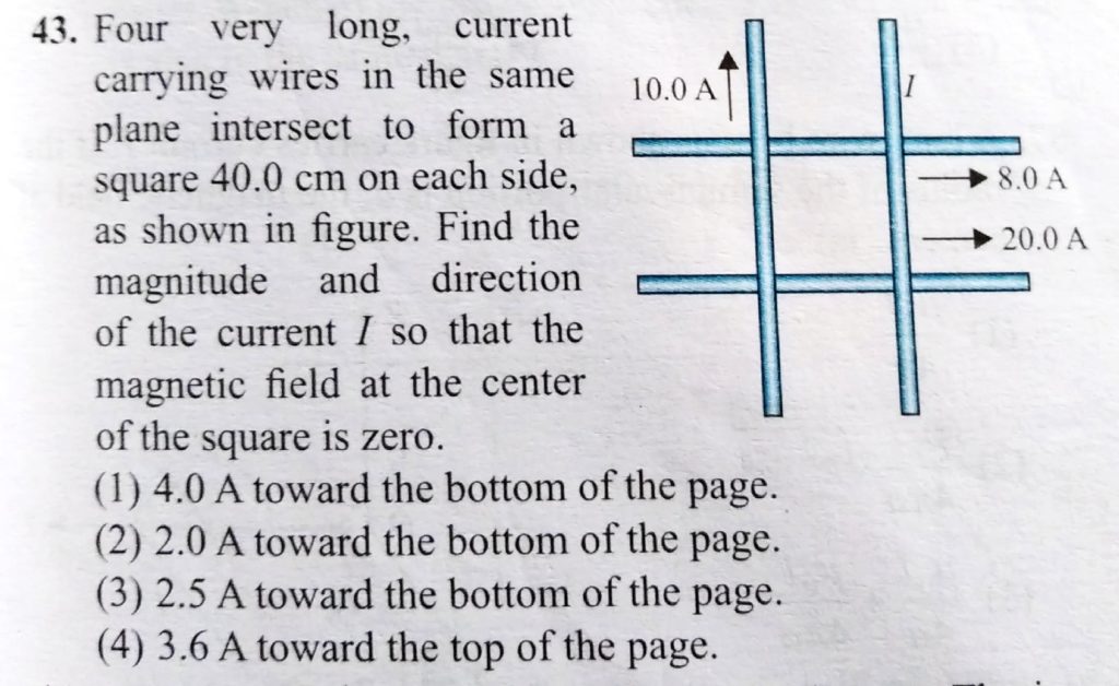 Four very long, current carrying wires in the same plane intersect to form a square 40.0 cm on each side, as shown in figure. Find the magnitude and direction of the current I so that the magnetic field at the centre of the square is zero. as shown in figure. Find the magnitude and direction of the current I so that the magnetic field at the centre of the square is zero. current carrying wires in the same plane intersect to form a square 40.0 cm on each side Four very long October 17, 2020 Category: Uncategorised (JEE Advanced Physics by BM Sharma + GMP Solutions) , Facebook Messenger WhatsApp Share this:TwitterFacebook Related