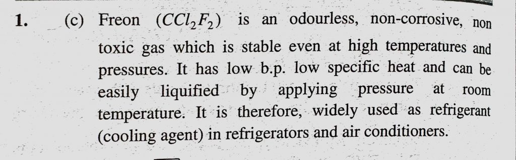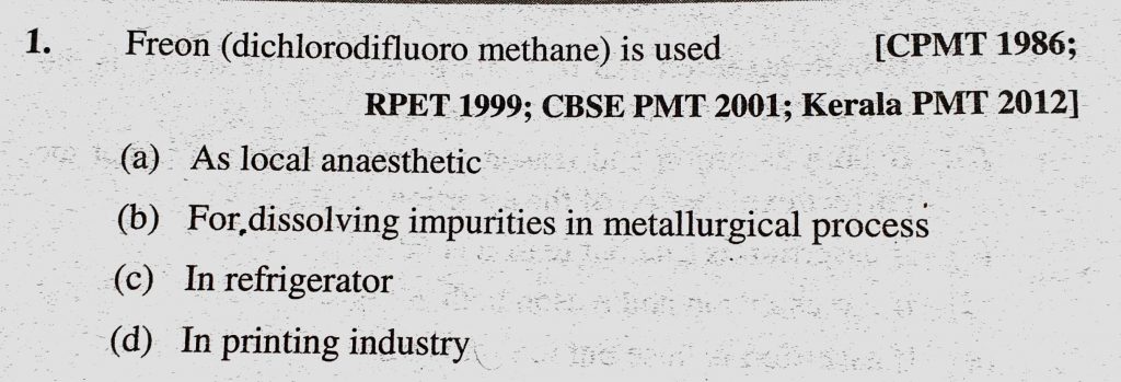 Freon (dichlorodifluoro methane) is used (a) As local anaesthetic (b) For dissolving impurities in metallurgical process (c) In refrigerator (d) In printing industry Freon (dichlorodifluoro methane) is used (a) As local anaesthetic (b) For dissolving impurities in metallurgical process (c) In refrigerator (d) In printing industry February 9, 2021 Category: Uncategorised (JEE Advanced Physics by BM Sharma + GMP Solutions) , Facebook Messenger WhatsApp Share this:TwitterFacebook Related