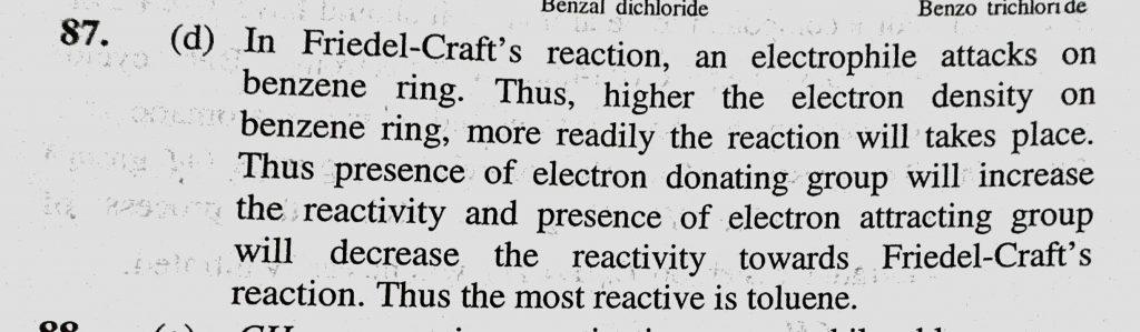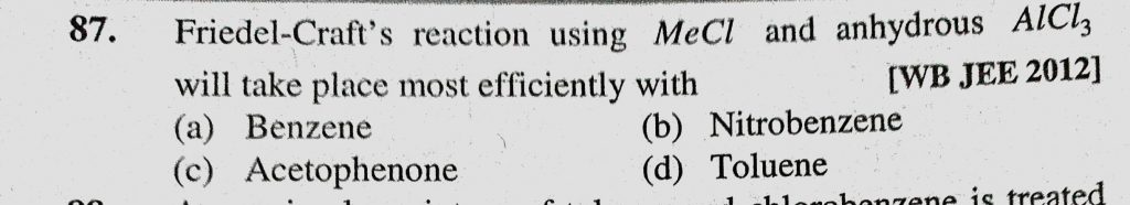 Friedel-Craft’s reaction using MeCl and anhydrous AlCl3 will take place most efficiently with (a) Benzene (b) Nitrobenzene (c) Acetophenone (d) Toluene Friedel-Craft's reaction using MeCl and anhydrous AlCl3 will take place most efficiently with (a) Benzene (b) Nitrobenzene (c) Acetophenone (d) Toluene December 15, 2020 Category: Uncategorised (JEE Advanced Physics by BM Sharma + GMP Solutions) , Facebook Messenger WhatsApp Share this:TwitterFacebook Related