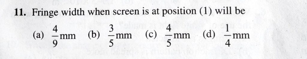 Fringe width when screen is at position (1) will be Fringe width when screen is at position (1) will be September 13, 2020 Category: Uncategorised (JEE Advanced Physics by BM Sharma + GMP Solutions) , Facebook Messenger WhatsApp Share this:TwitterFacebook Related