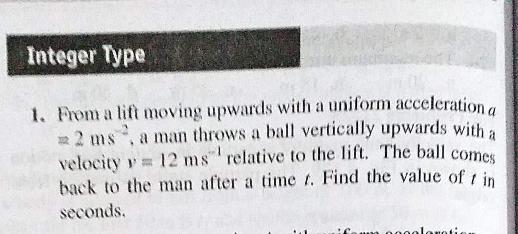 From a lift moving upwards with a uniform acceleration a = 2 m/s^2, a man throws a ball vertically upwards with a velocity v = 12 m/s relative to the lift. The ball comes back to the man a man throws a ball vertically upwards with a velocity v = 12 m/s relative to the lift. The ball comes back to the man From a lift moving upwards with a uniform acceleration a = 2 m/s^2 September 19, 2020 Category: Uncategorised (JEE Advanced Physics by BM Sharma + GMP Solutions) , Facebook Messenger WhatsApp Share this:TwitterFacebook Related