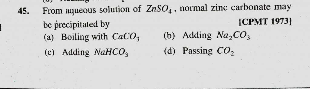 From aqueous solution of ZnSO4, normal zinc carbonate may be precipitated by (a) Boiling with CaCO3 (b) Adding Na2CO3 From aqueous solution of ZnSO4 normal zinc carbonate may be precipitated by (a) Boiling with CaCO3 (b) Adding Na2CO3 December 1, 2020 Category: Uncategorised (JEE Advanced Physics by BM Sharma + GMP Solutions) , Facebook Messenger WhatsApp Share this:TwitterFacebook Related