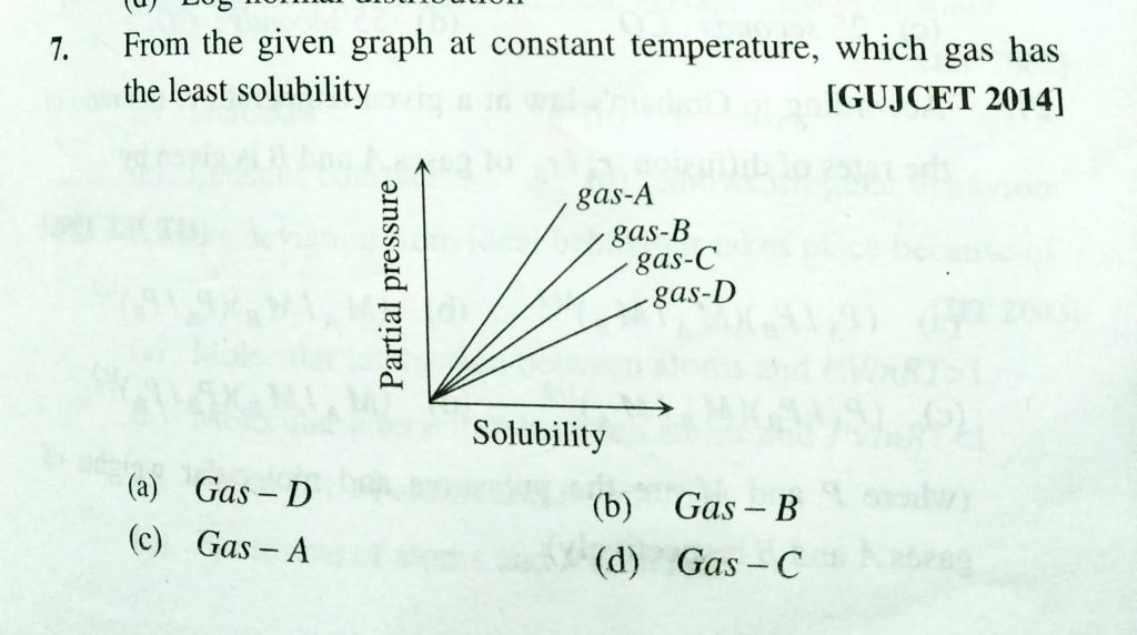 From the given graph at constant temperature , which gas has the least solubility (a) Gas- D (b) Gas -B (c) Gas – A (d) Gas – C From the given graph at constant temperature which gas has the least solubility (a) Gas- D (b) Gas -B (c) Gas - A (d) Gas - C February 12, 2021 Category: Uncategorised (JEE Advanced Physics by BM Sharma + GMP Solutions) , Facebook Messenger WhatsApp Share this:TwitterFacebook Related