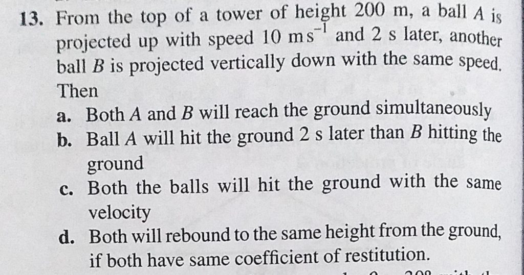 From the top of a tower of height 200 m, a ball A is projected up with speed 10 m/s and 2 s later, another ball B is projected vertically down with the same speed. Then a.Both A and B will reach the a ball A is projected up with speed 10 m/s and 2 s later another ball B is projected vertically down with the same speed. Then a.Both A and B will reach the From the top of a tower of height 200 m September 25, 2020 Category: Uncategorised (JEE Advanced Physics by BM Sharma + GMP Solutions) , Facebook Messenger WhatsApp Share this:TwitterFacebook Related