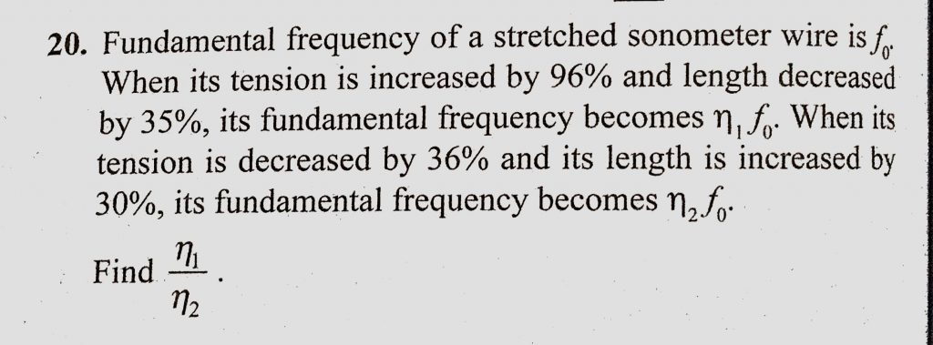 Fundamental frequency of a stretched sonometer wire is f0. When its tension is increased by 96% and length decreased by 35%, its fundamental frequency becomes n1f0. When its Fundamental frequency of a stretched sonometer wire is f0. When its tension is increased by 96% and length decreased by 35% its fundamental frequency becomes n1f0. When its November 7, 2020 Category: Uncategorised (JEE Advanced Physics by BM Sharma + GMP Solutions) , Facebook Messenger WhatsApp Share this:TwitterFacebook Related