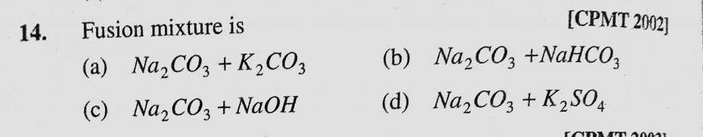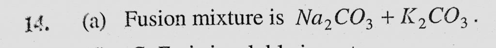 Fusion mixture is (a) Na2CO3 + K2CO3 (b) Na2CO3 + NaHCO3 (c) Na2CO3 + NaOH Fusion mixture is (a) Na2CO3 + K2CO3 (b) Na2CO3 + NaHCO3 (c) Na2CO3 + NaOH November 25, 2020 Category: Uncategorised (JEE Advanced Physics by BM Sharma + GMP Solutions) , Facebook Messenger WhatsApp Share this:TwitterFacebook Related
