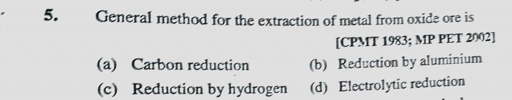 General method for the extraction of metal from oxide ore is (a) Carbon reduction (b) Reduction by aluminium (c) Reduction by hydrogen General method for the extraction of metal from oxide ore is (a) Carbon reduction (b) Reduction by aluminium (c) Reduction by hydrogen November 12, 2020 Category: Uncategorised (JEE Advanced Physics by BM Sharma + GMP Solutions) , Facebook Messenger WhatsApp Share this:TwitterFacebook Related