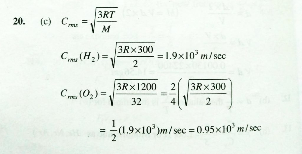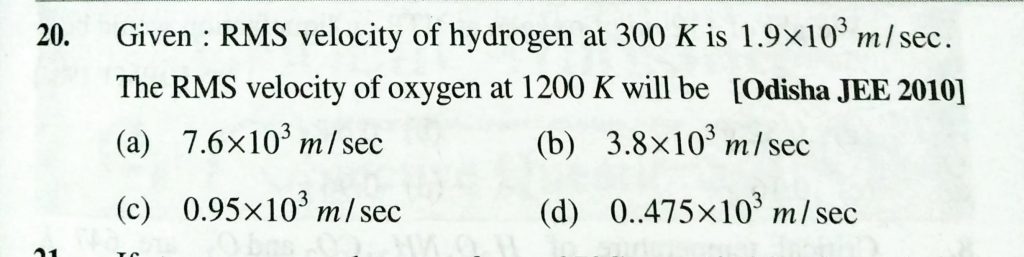 Given : RMS velocity of hydrogen at 300 K is 1.9 x 10^3 m/sec. The RMS velocity of oxygen at 1200 K will be Given : RMS velocity of hydrogen at 300 K is 1.9 x 10^3 m/sec. The RMS velocity of oxygen at 1200 K will be February 11, 2021 Category: Uncategorised (JEE Advanced Physics by BM Sharma + GMP Solutions) , Facebook Messenger WhatsApp Share this:TwitterFacebook Related