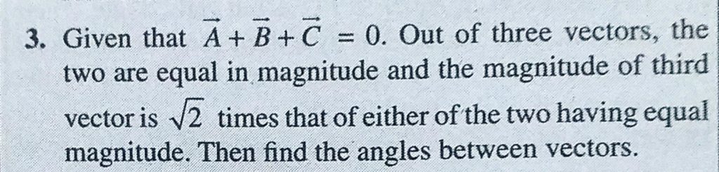 Given that A + B + C = 0. Out of three vectors, the two are equal in magnitude and the magnitude of third vector is root 2 times that of either of the two having equal magnitude. Given that A + B + C = 0. Out of three vectors the two are equal in magnitude and the magnitude of third vector is root 2 times that of either of the two having equal magnitude. September 16, 2020 Category: Uncategorised (JEE Advanced Physics by BM Sharma + GMP Solutions) , Facebook Messenger WhatsApp Share this:TwitterFacebook Related