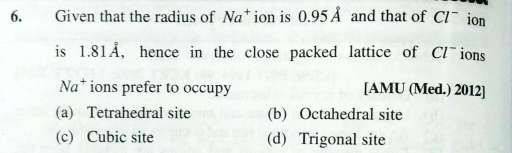 Given that the radius of Na^+ ion is 0.95 A and that of Cl^- ion is 1.81 A , hence in the close packed lattice of Cl^- ions Na^+ ions prefer to occupy Given that the radius of Na^+ ion is 0.95 A and that of Cl^- ion is 1.81 A hence in the close packed lattice of Cl^- ions Na^+ ions prefer to occupy December 17, 2020 Category: Uncategorised (JEE Advanced Physics by BM Sharma + GMP Solutions) , Facebook Messenger WhatsApp Share this:TwitterFacebook Related