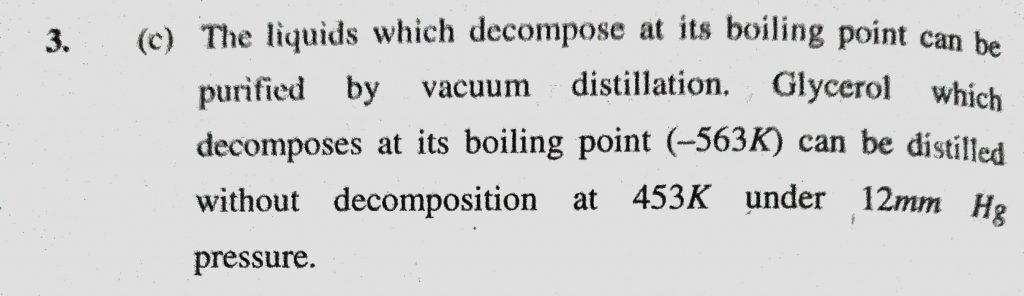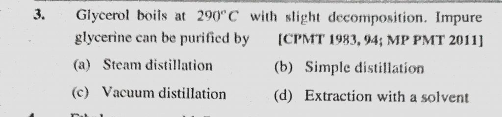 Glycerol boils at 290 C with slight decomposition. Impure glycerine can be purified by (a) Steam distillation (b) Simple distillation (c) Vacuum distillation (d) Extraction with a solvent Glycerol boils at 290 C with slight decomposition. Impure glycerine can be purified by (a) Steam distillation (b) Simple distillation (c) Vacuum distillation (d) Extraction with a solvent February 11, 2021 Category: Uncategorised (JEE Advanced Physics by BM Sharma + GMP Solutions) , Facebook Messenger WhatsApp Share this:TwitterFacebook Related