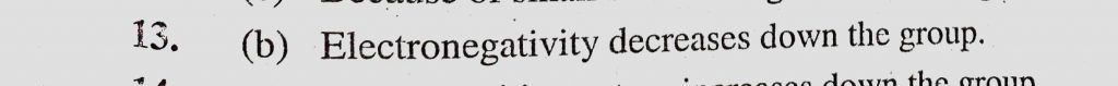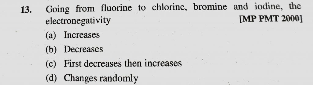 Going from fluorine to chlorine, bromine and iodine, the electronegativity (a) Increases (b) Decreases (c) First decreases then increases bromine and iodine Going from fluorine to chlorine the electronegativity (a) Increases (b) Decreases (c) First decreases then increases November 10, 2020 Category: Uncategorised (JEE Advanced Physics by BM Sharma + GMP Solutions) , Facebook Messenger WhatsApp Share this:TwitterFacebook Related