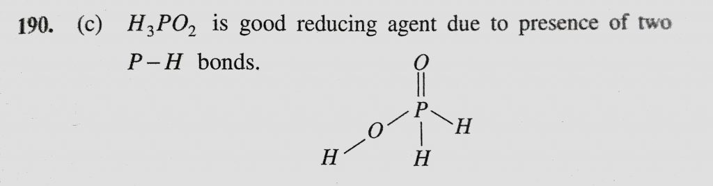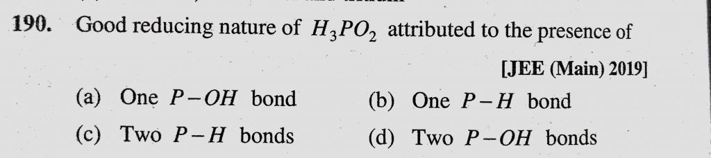 Good reducing nature of H3PO2 attributed to the presence of (a) One P-OH bond (b) One P-H bond (c) Two P-H bonds Good reducing nature of H3PO2 attributed to the presence of (a) One P-OH bond (b) One P-H bond (c) Two P-H bonds November 28, 2020 Category: Uncategorised (JEE Advanced Physics by BM Sharma + GMP Solutions) , Facebook Messenger WhatsApp Share this:TwitterFacebook Related