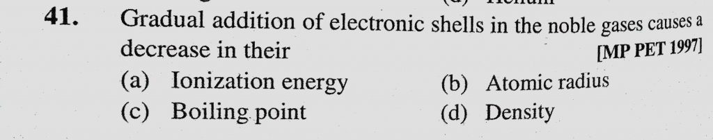 Gradual addition of electronic shells in the noble gases causes a decrease in their (a) Ionization energy (b) Atomic radius (c) Boiling point (d) Density Gradual addition of electronic shells in the noble gases causes a decrease in their (a) Ionization energy (b) Atomic radius (c) Boiling point (d) Density November 25, 2020 Category: Uncategorised (JEE Advanced Physics by BM Sharma + GMP Solutions) , Facebook Messenger WhatsApp Share this:TwitterFacebook Related