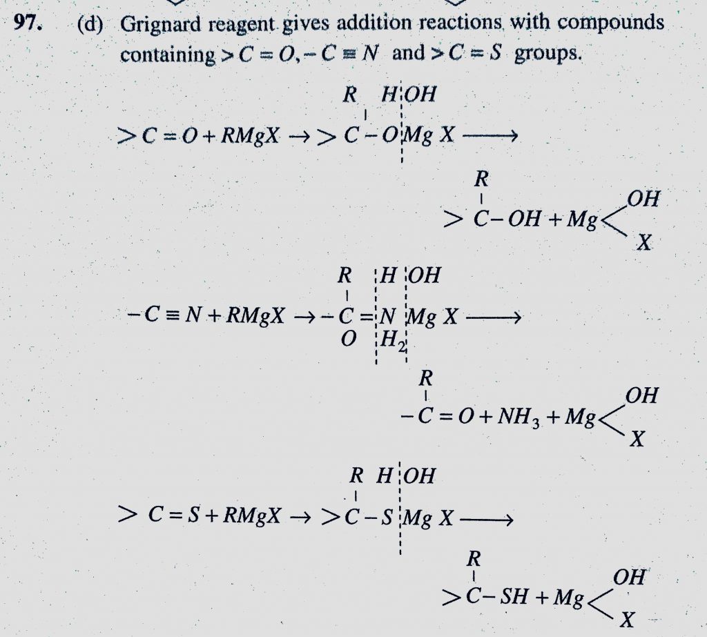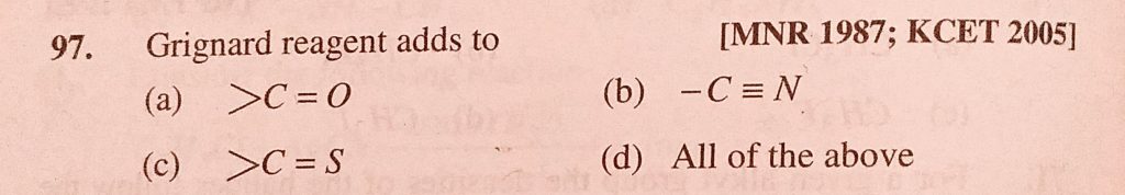 Grignard reagents adds to (a) C = O (b) -C =_ N (c) C = S (d) All of the above Grignard reagents adds to (a) C = O (b) -C =_ N (c) C = S (d) All of the above February 8, 2021 Category: Uncategorised (JEE Advanced Physics by BM Sharma + GMP Solutions) , Facebook Messenger WhatsApp Share this:TwitterFacebook Related