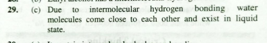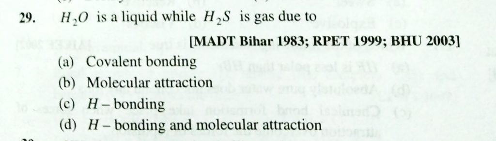H2O is a liquid while H2S is gas due to (a) Covalent bonding (b) Molecular attraction (c) H – bonding (d) H – bonding and molecular attraction H2O is a liquid while H2S is gas due to (a) Covalent bonding (b) Molecular attraction (c) H - bonding (d) H - bonding and molecular attraction December 9, 2020 Category: Uncategorised (JEE Advanced Physics by BM Sharma + GMP Solutions) , Facebook Messenger WhatsApp Share this:TwitterFacebook Related
