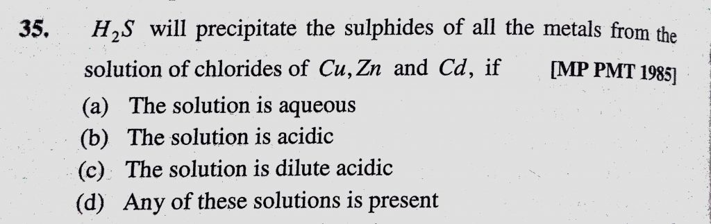 H2S will precipitate the sulphides of all the metals from the solution of chlorides of Cu, Zn and Cd, if (a) The solution is aqueous (b) The solution is acidic H2S will precipitate the sulphides of all the metals from the solution of chlorides of Cu if (a) The solution is aqueous (b) The solution is acidic Zn and Cd December 6, 2020 Category: Uncategorised (JEE Advanced Physics by BM Sharma + GMP Solutions) , Facebook Messenger WhatsApp Share this:TwitterFacebook Related