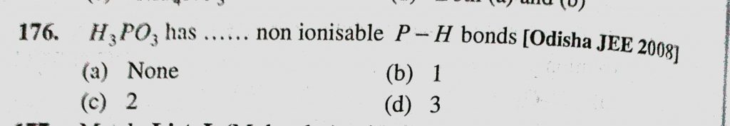 H3PO3 has …………… non ionisable P-H bonds (a) None (b) 1 (c) 2 (d) 3 H3PO3 has ............... non ionisable P-H bonds (a) None (b) 1 (c) 2 (d) 3 November 23, 2020 Category: Uncategorised (JEE Advanced Physics by BM Sharma + GMP Solutions) , Facebook Messenger WhatsApp Share this:TwitterFacebook Related