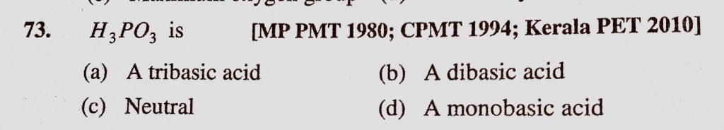 H3PO3 is (a) A tribasic acid (b) A dibasic acid (c) Neutral (d) A monobasic acid H3PO3 is (a) A tribasic acid (b) A dibasic acid (c) Neutral (d) A monobasic acid November 18, 2020 Category: Uncategorised (JEE Advanced Physics by BM Sharma + GMP Solutions) , Facebook Messenger WhatsApp Share this:TwitterFacebook Related