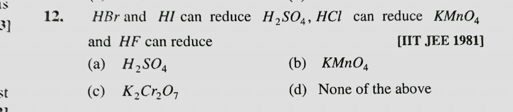 HBr and HI can reduce H2SO4 HCI can reduce KMnO4 and HF can reduce HBr and HI can reduce H2SO4 HCI can reduce KMnO4 and HF can reduce November 24, 2020 Category: Uncategorised (JEE Advanced Physics by BM Sharma + GMP Solutions) , Facebook Messenger WhatsApp Share this:TwitterFacebook Related