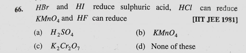 HBr and HI reduce sulphuric acid, HCl can reduce KMnO4 and HF can reduce (a) H2SO4 (b) KMnO4 (c) K2Cr2O7 (d) None of these HBr and HI reduce sulphuric acid HCl can reduce KMnO4 and HF can reduce (a) H2SO4 (b) KMnO4 (c) K2Cr2O7 (d) None of these November 27, 2020 Category: Uncategorised (JEE Advanced Physics by BM Sharma + GMP Solutions) , Facebook Messenger WhatsApp Share this:TwitterFacebook Related