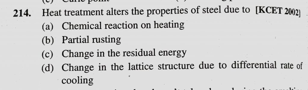 Heat treatment alters the properties of steel due to (a) Chemical reaction on heating (b) Partial rusting Heat treatment alters the properties of steel due to (a) Chemical reaction on heating (b) Partial rusting December 2, 2020 Category: Uncategorised (JEE Advanced Physics by BM Sharma + GMP Solutions) , Facebook Messenger WhatsApp Share this:TwitterFacebook Related