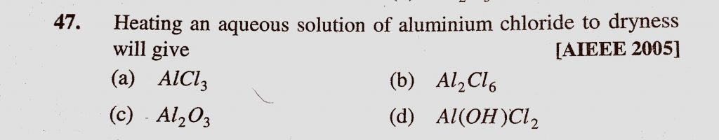 Heating an aqueous solution of aluminium chloride to dryness will give (a) AlCl3 (b) Al2Cl6 (c) Al2O3 Heating an aqueous solution of aluminium chloride to dryness will give (a) AlCl3 (b) Al2Cl6 (c) Al2O3 November 17, 2020 Category: Uncategorised (JEE Advanced Physics by BM Sharma + GMP Solutions) , Facebook Messenger WhatsApp Share this:TwitterFacebook Related