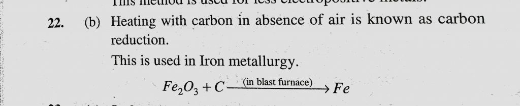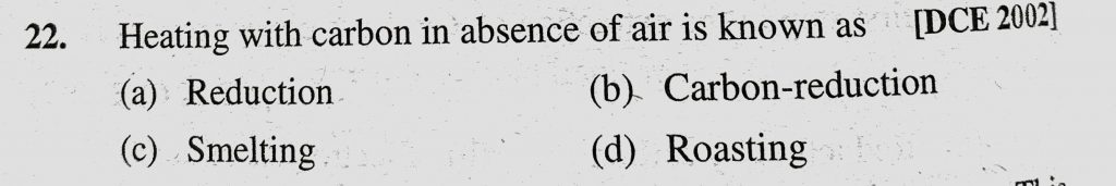 Heating with carbon in absence of air is known as (a) Reduction (b) Carbon-reduction (c) Smelting (d) Roasting Heating with carbon in absence of air is known as (a) Reduction (b) Carbon-reduction (c) Smelting (d) Roasting November 12, 2020 Category: Uncategorised (JEE Advanced Physics by BM Sharma + GMP Solutions) , Facebook Messenger WhatsApp Share this:TwitterFacebook Related