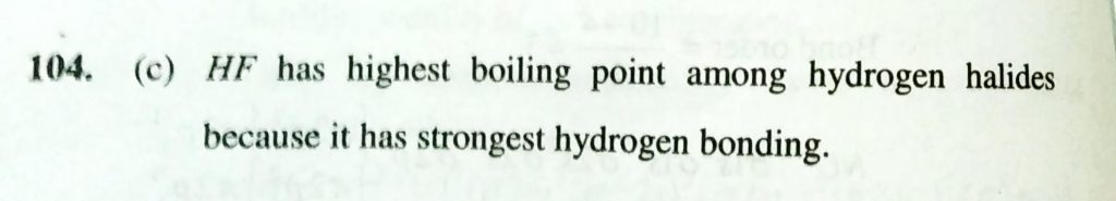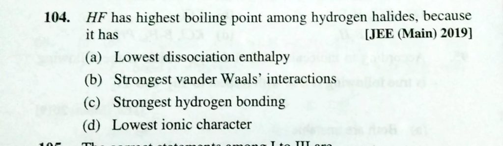 HF has highest boiling point among hydrogen halides, because it has (a) Lowest dissociation enthalpy (b) strongest vander waals’ interactions (c) strongest hydrogen bonding (d) Lowest ionic character because it has (a) Lowest dissociation enthalpy (b) strongest vander waals' interactions (c) strongest hydrogen bonding (d) Lowest ionic character HF has highest boiling point among hydrogen halides December 15, 2020 Category: Uncategorised (JEE Advanced Physics by BM Sharma + GMP Solutions) , Facebook Messenger WhatsApp Share this:TwitterFacebook Related