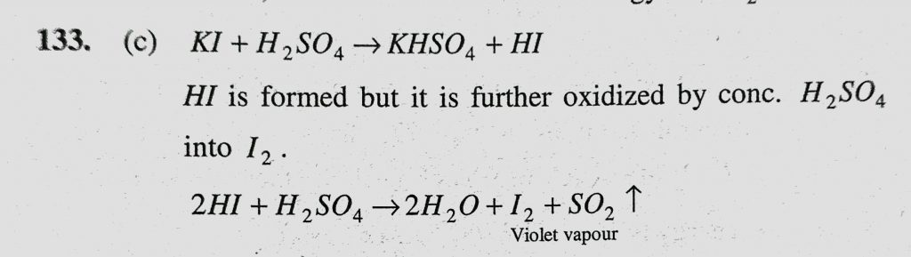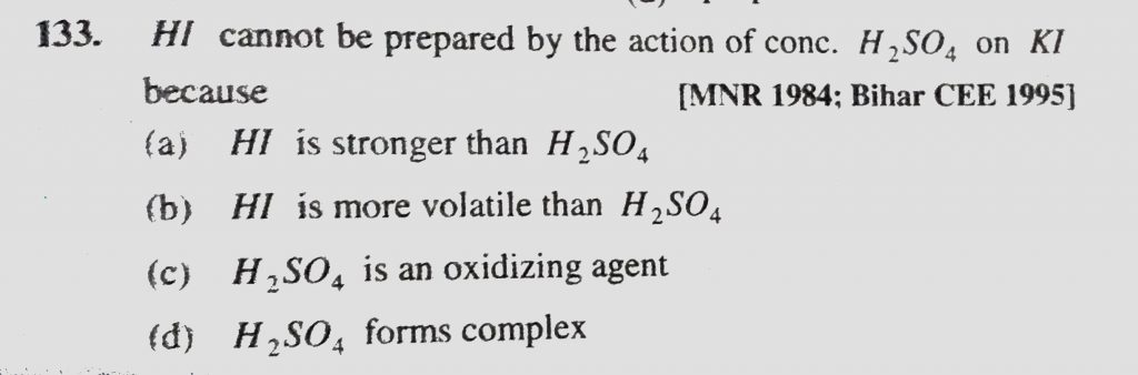 HI cannot be prepared by the action of conc. H2SO4 on KI because (a) HI is stronger than H2SO4 (b) HI is more volatile than H2SO4 HI cannot be prepared by the action of conc. H2SO4 on KI because (a) HI is stronger than H2SO4 (b) HI is more volatile than H2SO4 November 24, 2020 Category: Uncategorised (JEE Advanced Physics by BM Sharma + GMP Solutions) , Facebook Messenger WhatsApp Share this:TwitterFacebook Related