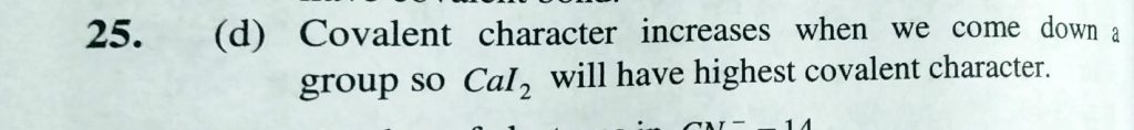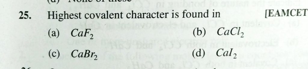 Highest covalent character is found in (a) CaF2 (b) CaCL2 (c) CaBr2 (d) CaI2 Highest covalent character is found in (a) CaF2 (b) CaCL2 (c) CaBr2 (d) CaI2 December 1, 2020 Category: Uncategorised (JEE Advanced Physics by BM Sharma + GMP Solutions) , Facebook Messenger WhatsApp Share this:TwitterFacebook Related