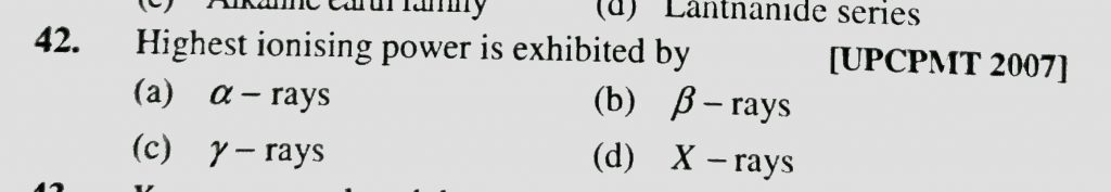 Highest ionising power is exhibited by (a) Alpha – rays (b) Bita – rays (c) gamma – rays (d) X – rays Highest ionising power is exhibited by (a) Alpha - rays (b) Bita - rays (c) gamma - rays (d) X - rays February 14, 2021 Category: Uncategorised (JEE Advanced Physics by BM Sharma + GMP Solutions) , Facebook Messenger WhatsApp Share this:TwitterFacebook Related