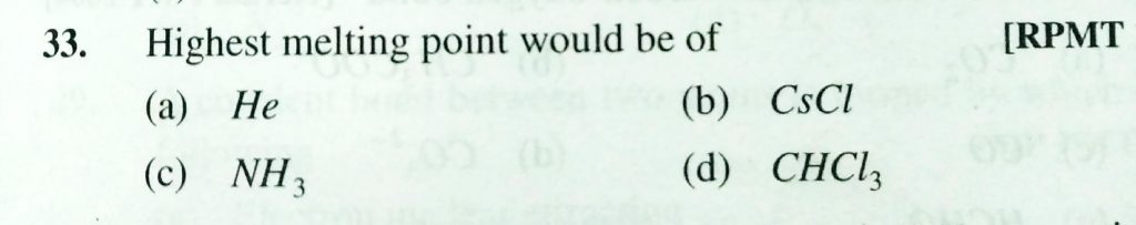 Highest melting point would be of (a) He (b) CsCl (c0 NH3 (d) CHCl3 Highest melting point would be of (a) He (b) CsCl (c0 NH3 (d) CHCl3 December 1, 2020 Category: Uncategorised (JEE Advanced Physics by BM Sharma + GMP Solutions) , Facebook Messenger WhatsApp Share this:TwitterFacebook Related