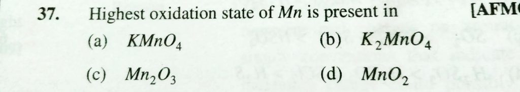 Highest oxidation state of Mn is present in (a) KMnO4 (b) K2MnO4 (c) Mn2O3 (d) MnO2 Highest oxidation state of Mn is present in (a) KMnO4 (b) K2MnO4 (c) Mn2O3 (d) MnO2 November 24, 2020 Category: Uncategorised (JEE Advanced Physics by BM Sharma + GMP Solutions) , Facebook Messenger WhatsApp Share this:TwitterFacebook Related