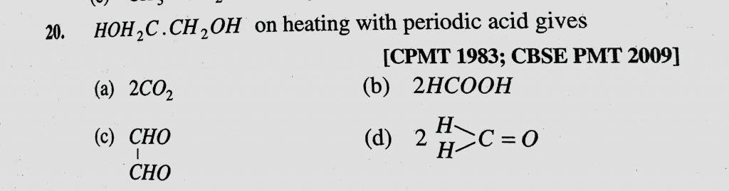 HOH2C. CH2OH on heating with periodic acid gives (a) 2CO2 (b) 2HCOOH (c) CHO – CHO HOH2C. CH2OH on heating with periodic acid gives (a) 2CO2 (b) 2HCOOH (c) CHO - CHO February 10, 2021 Category: Uncategorised (JEE Advanced Physics by BM Sharma + GMP Solutions) , Facebook Messenger WhatsApp Share this:TwitterFacebook Related