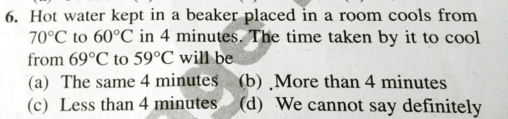 Hot water in a beaker placed in a room cools from 70 degree to 60 degreee C in 4 min. The time taken by it cool from 69 degree C to 59 degree C will be Hot water in a beaker placed in a room cools from 70 degree to 60 degreee C in 4 min. The time taken by it cool from 69 degree C to 59 degree C will be October 4, 2020 Category: Uncategorised (JEE Advanced Physics by BM Sharma + GMP Solutions) , Facebook Messenger WhatsApp Share this:TwitterFacebook Related