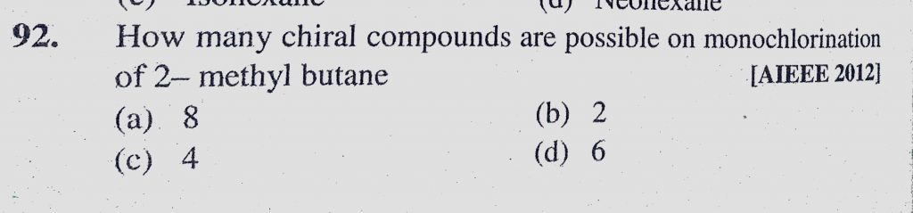 How many chiral compounds are possible on monochlorination of 2-methyl butane (a) 8 (b) 2 (c) 4 (d) 6 How many chiral compounds are possible on monochlorination of 2-methyl butane (a) 8 (b) 2 (c) 4 (d) 6 December 12, 2020 Category: Uncategorised (JEE Advanced Physics by BM Sharma + GMP Solutions) , Facebook Messenger WhatsApp Share this:TwitterFacebook Related