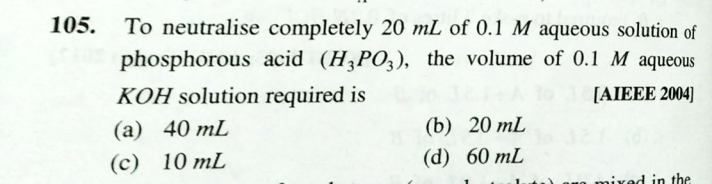 To neutralize completely 20mL of 0.1M aqueous solution of phosphorus (H3PO3) acid the volume of 0.1 M aqueous KOH solution required is: To neutralize completely 20mL of 0.1M aqueous solution of phosphorus (H3PO3) acid the volume of 0.1M aqueous KOH solution required is: December 11, 2020 Category: Uncategorised (JEE Advanced Physics by BM Sharma + GMP Solutions) , Facebook Messenger WhatsApp Share this:TwitterFacebook Related