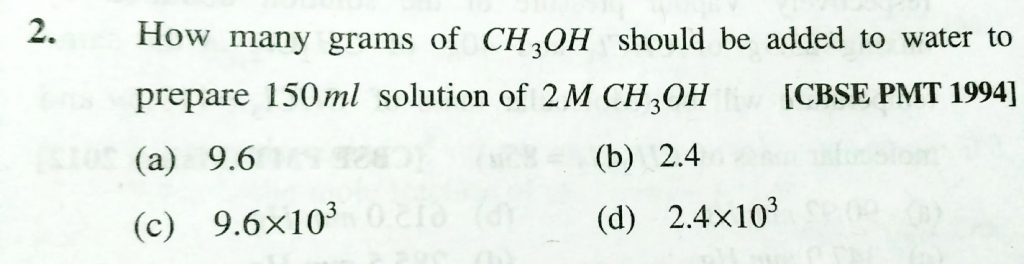 How many grams of CH3OH should be added to water to prepare 150 ml solution of 2 M CH3OH How many gra mms of CH3OH should be added to water to prepare 150 ml solution of 2 M CH3OH December 12, 2020 Category: Uncategorised (JEE Advanced Physics by BM Sharma + GMP Solutions) , Facebook Messenger WhatsApp Share this:TwitterFacebook Related