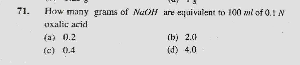 How many grams fo NaOH are equivalent to 100 ml of 0.1 N oxalic acid (a) 0.2 (b) 2.0 (c) 0.4 How many grams fo NaOH are equivalent to 100 ml of 0.1 N oxalic acid (a) 0.2 (b) 2.0 (c) 0.4 December 7, 2020 Category: Uncategorised (JEE Advanced Physics by BM Sharma + GMP Solutions) , Facebook Messenger WhatsApp Share this:TwitterFacebook Related