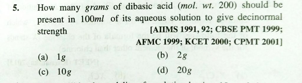 How many grams of dibasic acid (mpol. wt. 200 ) should be present in 100 ml of its aqueous solution to give decinormal strength How many grams of dibasic acid (mpol. wt. 200 ) should be present in 100 ml of its aqueous solution to give decinormal strength December 10, 2020 Category: Uncategorised (JEE Advanced Physics by BM Sharma + GMP Solutions) , Facebook Messenger WhatsApp Share this:TwitterFacebook Related