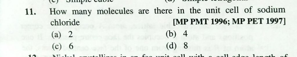 How many molecules are there in the unit cell sodium chloride (a) 2 (b) 4 (c) 6 (d) 8 How many molecules are there in the unit cell sodium chloride (a) 2 (b) 4 (c) 6 (d) 8 December 16, 2020 Category: Uncategorised (JEE Advanced Physics by BM Sharma + GMP Solutions) , Facebook Messenger WhatsApp Share this:TwitterFacebook Related